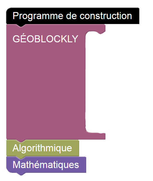 Ce logiciel en ligne propose d’écrire un programme de construction par le biais d’une interface par bloc « à la Scratch », permettant ainsi de travailler à la fois la syntaxe de la géométrie plane et les concepts propres à l’algorithmique (séquence, boucle, variable, test…).